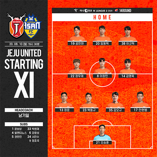 최근 2경기에서 승리가 없던 제주는 4-3-3 전형으로 나섰다. 임동혁을 중심으로 공민현과 이규혁이 최전방에 위치했고 이창민, 김영욱이 중원을 지켰다. 측면 수비수인 안현범이 전진해 정우재와 짝을 이뤄 백스리 형태로 움직였다. 수비진은 정운, 백동규, 김오규가 꾸렸고 오승훈이 골키퍼 장갑을 꼈다.