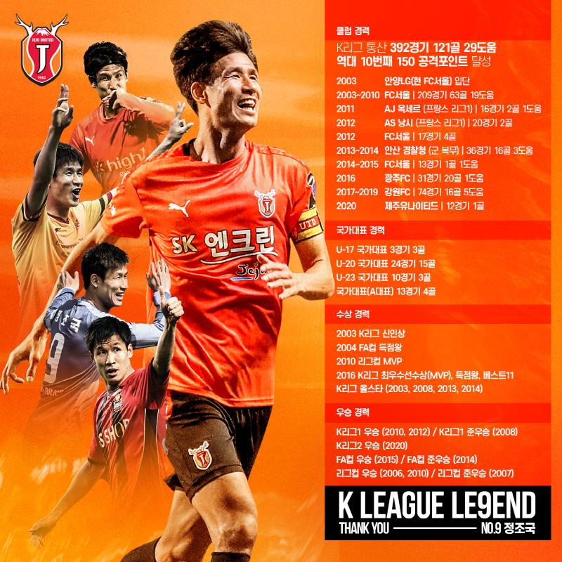 정조국은 2016년 광주에서 '제2의 전성기'를 함께한 남기일 감독의 부름을 받아 올 시즌 제주유나이티드에 합류했다. 그동안 익숙했던 주인공은 아니었지만 당당한 조연이자, 후배들과 선의의 경쟁을 펼친 최고의 페이스메이커로 K리그2 우승과 승격이라는 금자탑을 자신의 커리어에 가로 새겼다. 특히 정조국은 6월 20일 충남 아산 원정(2-0)에서 선제 결승골을 터트리며 제주 이적 후 첫 골과 함께 K리그 통산 공격포인트 150개(121골 29도움) 고지에 올랐다. K리그 역사에서 공격포인트 150개 이상을 기록한 선수는 정조국 포함 10명에 불과하다.