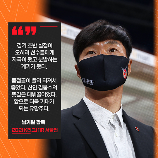 귀중한 동점골이자 K리그 데뷔골을 터트린 신인 김봉수의 활약에 대해서는 "동점골을 빨리 넣어서 좋았다. 신인 김봉수의 데뷔골이었는데 뜻깊은 득점이었다. 좋은 폼을 보이고 있고 계속 기대가 되는 선수"라고 엄지손가락을 치켜세웠다.