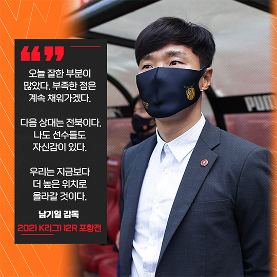 제주는 다음달 2일 선두 전북 현대 원정을 떠난다. 현재 1강이지만 제주의 짠물 수비(12경기 8실점)라면 충분히 해볼 만한 상대다. 남기일 감독은 “오늘 포항전에서도 잘한 부분이 많았다. 물론 채울 점도 보였다. 부족한 점을 조금씩 채워가고 개선하면 발전할 거로 생각한다. 전북을 상대로 우리가 할 수 있는 방법을 통해 풀어가겠다. 나도 선수들도 자신감 있다. 우리는 지금보다 더 높은 위치로 올라갈 것”이라며 각오를 다졌다.