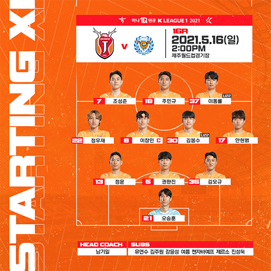 홈팀 제주는 3-4-3 포메이션을 가동했다. 조성준, 주민규, 이동률이 쓰리톱으로 나섰고, 정우재, 이창민, 김봉수, 안현범이 좌우 측면과 중원에 자리했다. 쓰리백은 정운, 권한진, 김오규가 호흡을 맞췄고 골문은 오승훈 골키퍼가 지켰다.