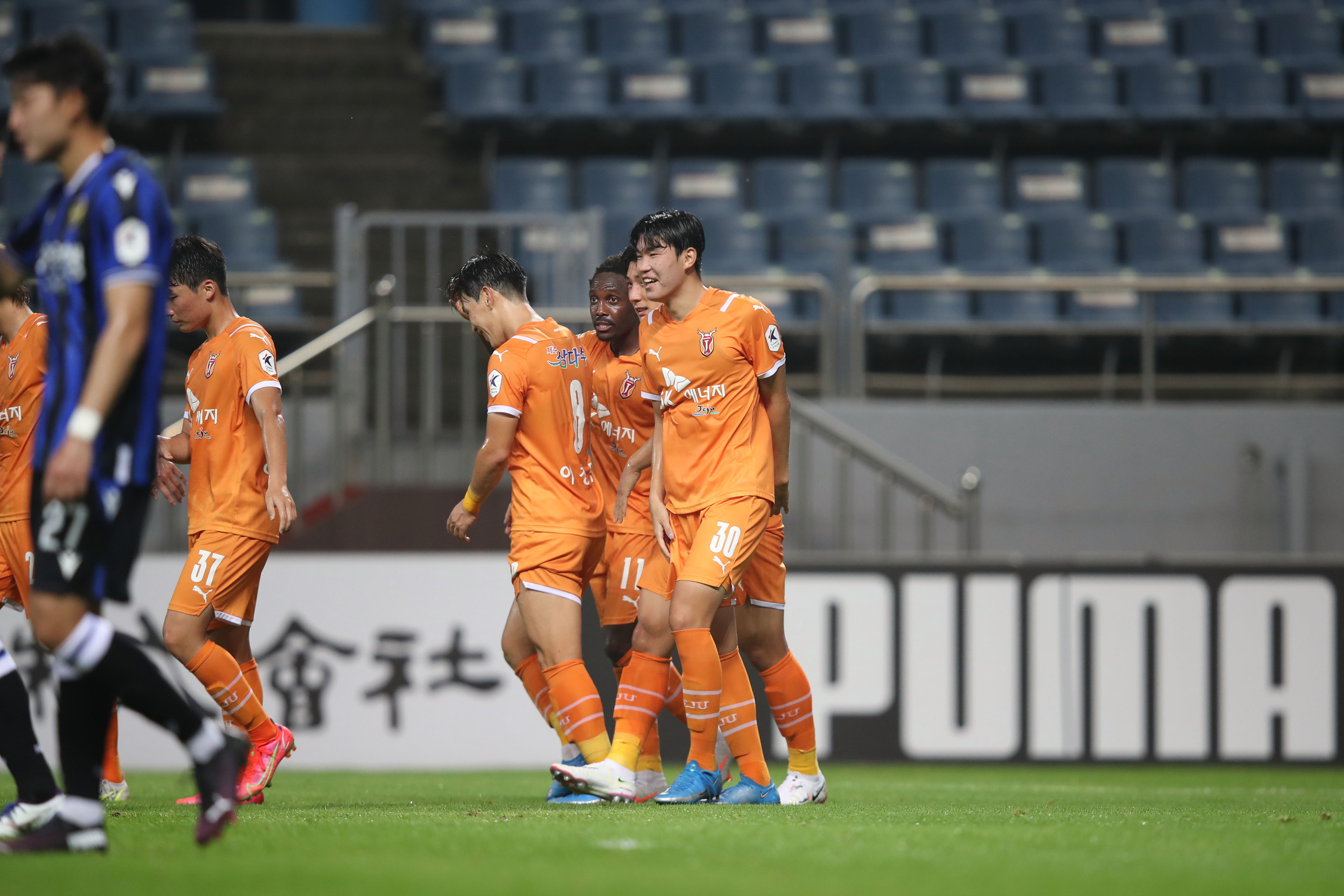 동점골을 위해 라인을 끌어올려 골문을 두드리던 제주가 연속골을 허용했다. 후반 37분 무고사, 후반 45분 송시우가 추가골을 넣었다.