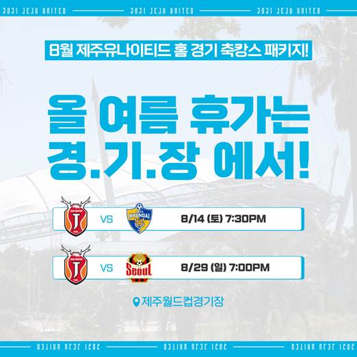 제주는 8월 홈 2경기를 앞두고 있다. 8월 14일(토) 오후 7시30분에는 울산 현대와 8월 29일(일) 오후 7시에는 FC 서울을 상대한다. 치열한 순위 경쟁만큼이나 코로나 19 및 무더위에 대한 스트레스도 덩달아 커지고 있다. 이에 제주는 코로나 19로 여행이 그리운 팬들과 올해 역대급으로 예고된 무더위를 피하기 위해 8월 홈 2경기에서 특별한 이벤트를 준비했다. 이름하여 '8월 제주유나이티드 홈 경기 축캉스 패키지.'
