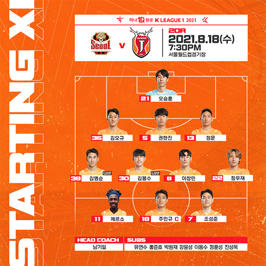 제주는 3-4-3 포메이션으로 임했다. 오승훈(GK) – 정운, 권한진, 김오규 – 정우재, 이창민, 김봉수, 김명순 – 제르소, 주민규, 조성준이 선발로 기용됐다.