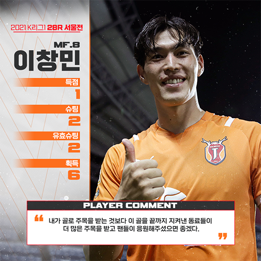 이날 결승골의 주인공 이창민은 경기 후 인터뷰에서 "8위라는 순위를 부정하고 싶다. 우리가 처음 목표했던 3위라는 목표를 향해 시즌이 끝날 때까지 끝까지 부정하면서 최선을 다하겠다. 안될 때 선수들끼리 서로 독려한다. '왜 이러나'라는 말보다 '할 수 있다' 또는 '나아질 수 있으니 힘내자'라고 말했다. 이러한 부분이 오늘 승리에 많은 영향을 끼쳤다"라고 말했다.