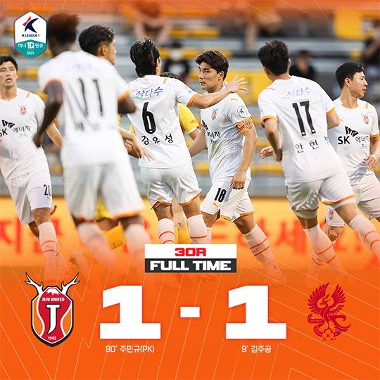 제주가 동점에 성공했다. 후반 45분 제르소의 슈팅이 이지훈 손에 맞았다. 주심은 VAR(비디오 판독)을 통해 페널티 킥을 선언했고, 키커로 나선 주민규가 마무리하면서 1-1로 끝났다.