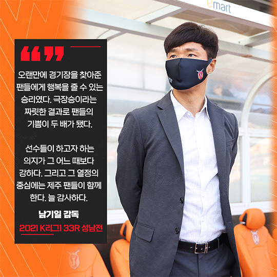 제주유나이티드(이하 제주)의 남기일 감독이 극장승으로 막을 내린 성남 FC전에 대한 기쁨을 팬들과 함께 나눴다.