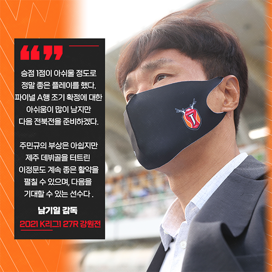 경기 후 남기일 감독은 "승점 1점이 아쉬울 정도로 정말 좋은 플레이를 했따. 파이널 A행 조기 확정에 대한 아쉬움이 많이 남지만 다음 전북전을 준비하겠다"라고 말했다.