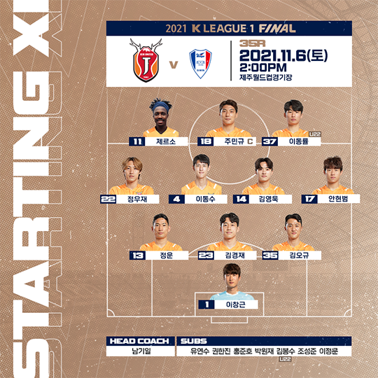 홈팀 제주는 3-4-3 포메이션을 가동했다. 제르소-주민규-이동률(U-22), 정우재-이동수-김영욱-안현범, 정운-김경재-김오규, 이창근(GK)이 선발라인업에 이름을 올렸다. 중원의 핵심 이창민은 최근 상무 테스트 과정에서 햄스트링 부상으로 출전 명단에서 제외됐다.