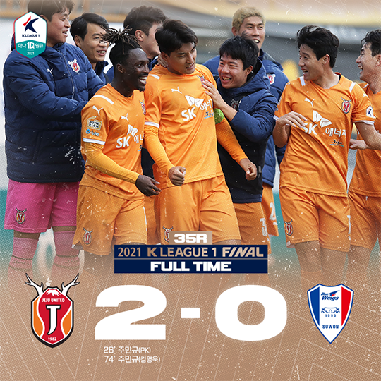 제주는 6일(토) 오후 2시 제주월드컵경기장에서 열린 수원과의 하나원큐 K리그1 2021 35라운드 홈 경기에서 2-0 승리를 거뒀다. 주민규는 이날 또 다시 멀티골을 터트리며 최근 3경기 연속 멀티골 행진과 함께 득점 1위(21골) 자리를 더욱 공고히 가져갔다.