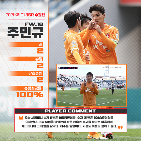 선제 득점 이후 자신의 두 손으로 숫자 '8'과 '21'를 표현한 특별한 세리머니에 대해서는 "숫자 8번은 (이)창민이를, 숫자 21번은 (오)승훈이형을 의미한다. 모두 부상을 당했는데 빠른 쾌유와 복귀를 바라는 마음에서 세리머니에 그 바람을 담았다. 제주는 원팀이다. 기쁨도 아픔도 함께 나눈다"라고 말했다.