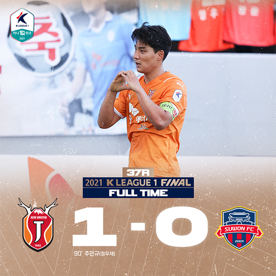 제주는 27일(토) 오후 2시 제주월드컵경기장에서 열린 수원FC와의 하나원큐 K리그1 2021 37라운드 홈 경기에서 경기 막판에 터진 주민규의 결승골을 앞세워 1-0 승리를 거뒀다. 리그 득점 1위(22골) 주민규는 K리그 통산 12번째 100호골의 금자탑을 세웠다.