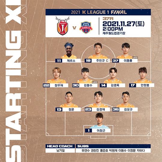 홈팀 제주는 3-4-3 포메이션을 가동했다. 제르소, 주민규, 이동률이 최전방에 포진했고 정우재, 김봉수, 김영욱, 안현범이 2선 지원에 나섰다. 쓰리백은 정운, 김경재, 김오규의 조합으로, 골문은 이창근이 지켰다.