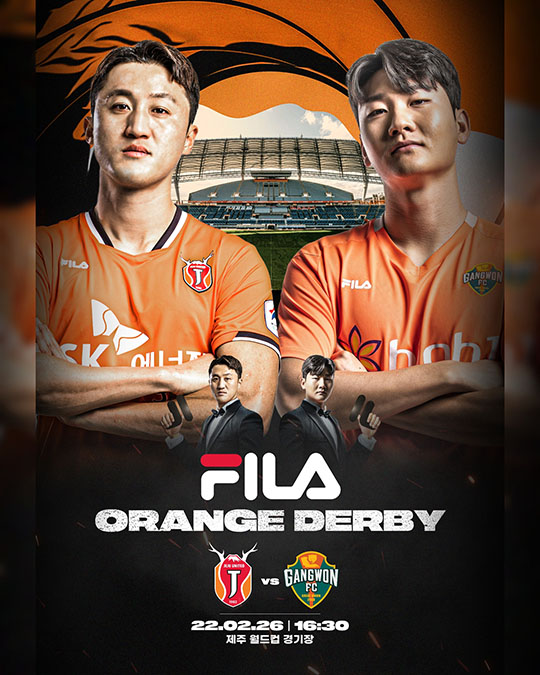 제주는 26일(토) 오후 4시30분 제주월드컵경기장에서 열리는 하나원큐 K리그1 2022 2라운드 홈 경기에서 강원과 격돌한다. 이날 경기는 '휠라 오렌지 더비'다. 글로벌 스포츠 브랜드 '휠라'가 후원하는 양 구단의 첫 맞대결을 기념해 다양한 이벤트를 진행된다.