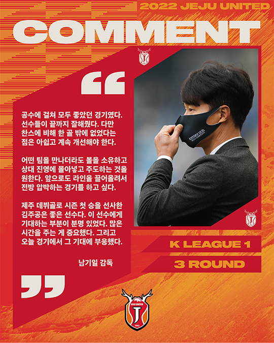 경기 후 남기일 감독은 "공수에 걸쳐 모두 좋았던 경기였다. 선수들이 끝까지 잘해줬다. 다만 찬스에 비해 한 골 밖에 없었다는 점은 아쉽고 계속 개선해야 한다"라고 말했다.