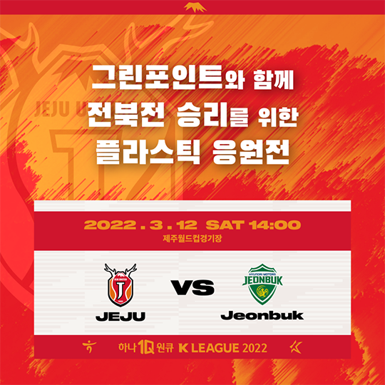 제주유나이티드(이하 제주)가 전북 현대와의 맞대결에서 다양한 이벤트와 함께 '그린포인트와 함께하는 플라스틱 응원전'을 펼친다.
