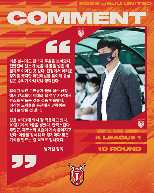 제주의 출발은 좋았지만 성남의 반격에 다소 애를 먹었다. 남기일 감독도 "초반에 우리가 좋았고 2골을 넣었을 때 쉽게 갈 것이라는 생각을 했다. 성남이 뒷심을 발휘하며 외국인 선수들이 잘해줘 '자칫하면 비길 수도 있겠다'는 생각을 할 정도였다"면서 "모든 경기가 편하게 흘러갔으면 하는 바람이지만 K리그는 편한 상대가 없다"라고 설명했다.