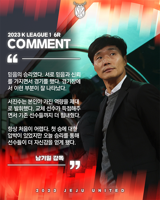 제주유나이티드(이하 제주)의 남기일 감독이 시즌 첫 승을 위해 믿음에 신뢰를 더한 선수들에 대한 고마움을 전했다.