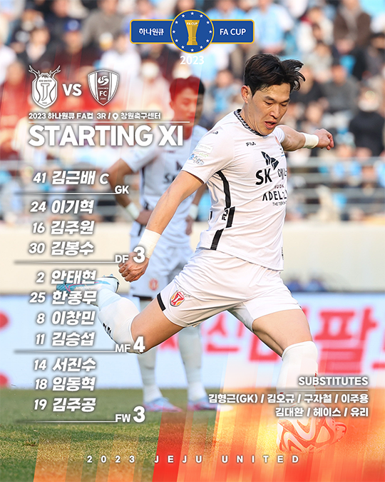 제주는 4월 12일(수) 오후 7시 창원축구센터에서 열린 2023 하나원큐 FA컵 3라운드 원정경기에서 경기 막판 구자철의 결승골에 힘입어 창원시청축구단을 2-1로 격파하며 16강 무대에 올랐다. 오는 5월 24일(수) 오후 7시(장소미정) 대전하나시티즌과 거제시민축구단전 승자와 FA컵 16강전을 치른다.