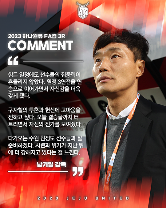 제주는 4월 12일(수) 오후 7시 창원축구센터에서 열린 2023 하나원큐 FA컵 3라운드 원정경기에서 경기 막판 구자철의 결승골에 힘입어 창원시청축구단을 2-1로 격파하며 16강 무대에 올랐다. 오는 5월 24일(수) 오후 7시(장소미정) 대전하나시티즌과 FA컵 16강전을 치른다.