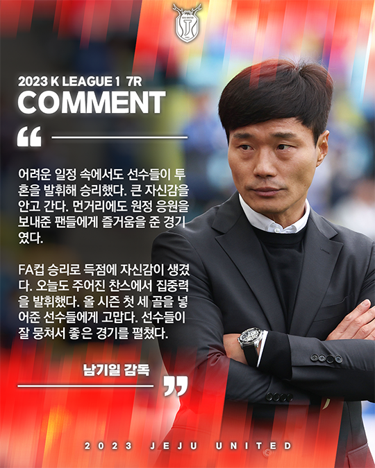 제주유나이티드(이하 제주)의 남기일 감독이 다득점과 함께 시즌 첫 연승을 거둔 선수들에게 박수를 보냈다.