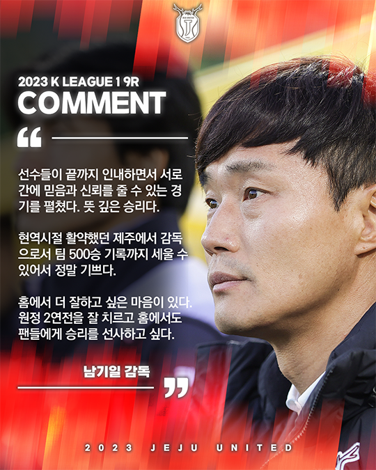 이에 남기일 감독은 "현역시절 활약했던 제주에서 감독으로서 팀 500승이라는 기록까지 세울 수 있어서 정말 기쁘다. 힘든 여정에도 항상 최선을 다하는 선수들과 사무국, 그리고 끝까지 함께 뛰는 제주의 12번째 선수 팬과 도민들에게 감사의 말을 전하고 싶다"라고 말했다.