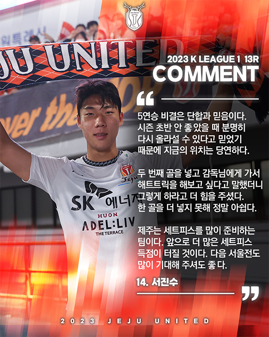 제주는 5월 14일(일) 오후 7시 수원종합운동장에서 열린 하나원큐 K리그1 2023 13라운드 원정경기에서 5-0 완승을 거뒀다. 이날 승리로 제주는 리그 5연승과 함께 7승 2무 4패 승점 23점 고지에 올랐다. 승점이 같은 포항을 다득점에서 20:19로 앞서며 3위로 올라섰다. 승리의 주역은 단연 서진수였다. 이날 2골 1도움의 맹활약을 펼쳤다.