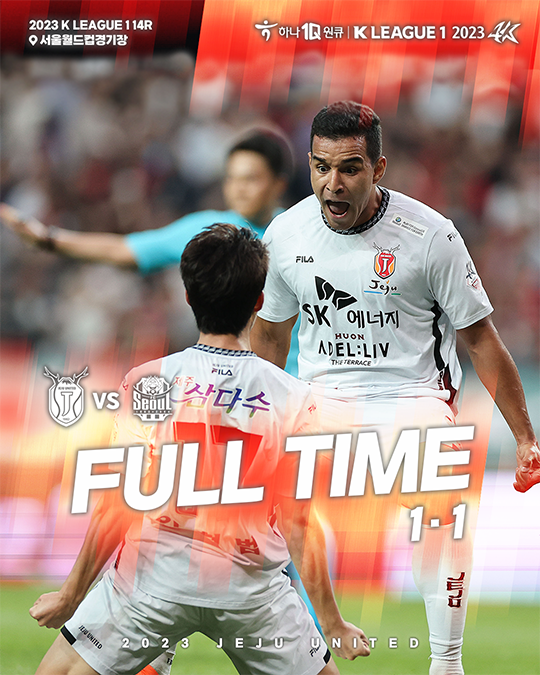 제주는 5월 20일(토) 오후 6시 서울월드컵경기장에서 열린 하나원큐 K리그1 2023 14라운드 원정경기에서 서울과 1-1로 비겼다. 구단 최다 연승 기록인 6연승에 도전했던 제주의 도전은 아쉽게 무산됐다. 이날 무승부로 제주는 7승 3무 4패 승점 24점을 기록했다.