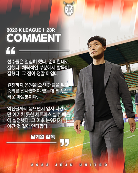 이어 팬들에 대한 미안함도 전했다. 남기일 감독은 "원정까지 응원을 오신 팬들을 위해 승리를 선사했어야 했는데 죄송스러운 마음뿐이다."라고 말했다.