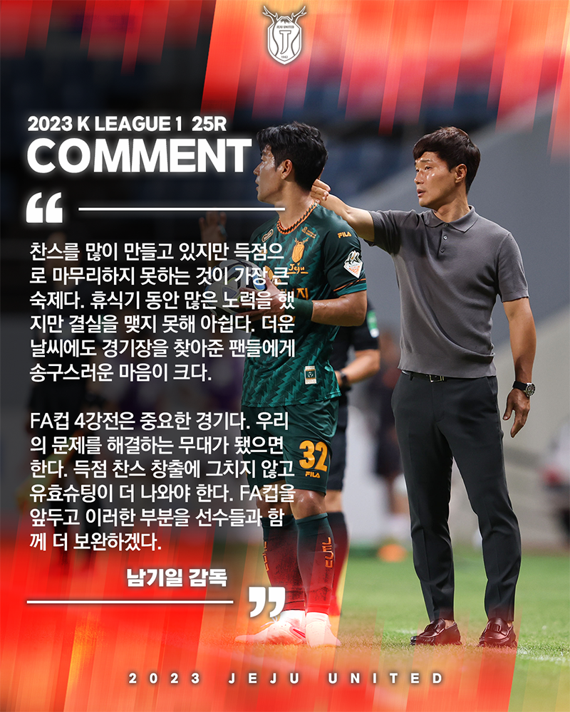 경기 후 남기일 감독은 "찬스를 많이 만들고 있지만 득점으로 마무리하지 못하는 것이 가장 큰 숙제다. 휴식기 동안 많은 노력을 했지만 결실을 맺지 못해 아쉽다. 더운 날씨에도 경기장을 찾아준 팬들에게 송구스러운 마음이 크다"라고 경기 소감을 전했다.