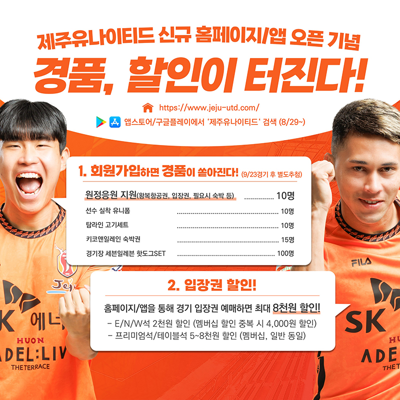 신규 홈페이지/앱 회원가입만해도 풍성한 혜택을 제공한다. 오는 9월 23일(토) FC 서울과의 홈 경기 당일까지 신규 홈페이지/앱 회원가입자를 대상으로 추첨을 통해 원정 응원 지원 10명(항공, 필요시 숙박), 선수 실착 유니폼(10명), 탐라인 고기세트(10명), 키코앤일레인 숙박권(15명), 경기장 세븐일레븐 핫도그SET(100명) 등 푸짐한 경품을 제공한다.
