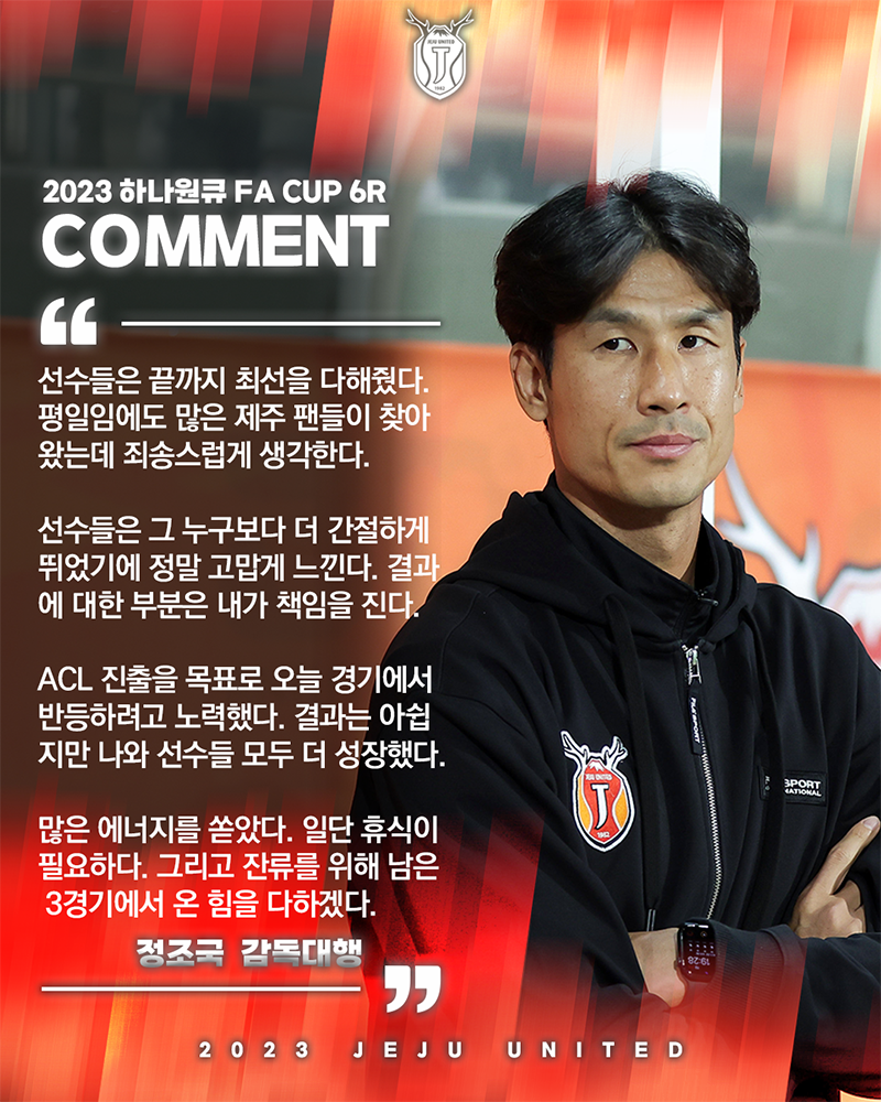 경기 후 정조국 감독대행은 "선수들은 최선을 다해줬다. 평일임에도 많은 제주 팬들이 찾아왔는데 죄송스럽게 생각한다. 선수들은 그 누구보다 더 간절하게 뛰었기에 정말 고맙게 느낀다. 결과에 대한 부분은 내가 책임진다."라고 실의에 빠진 선수들과 팬들을 독려했다.