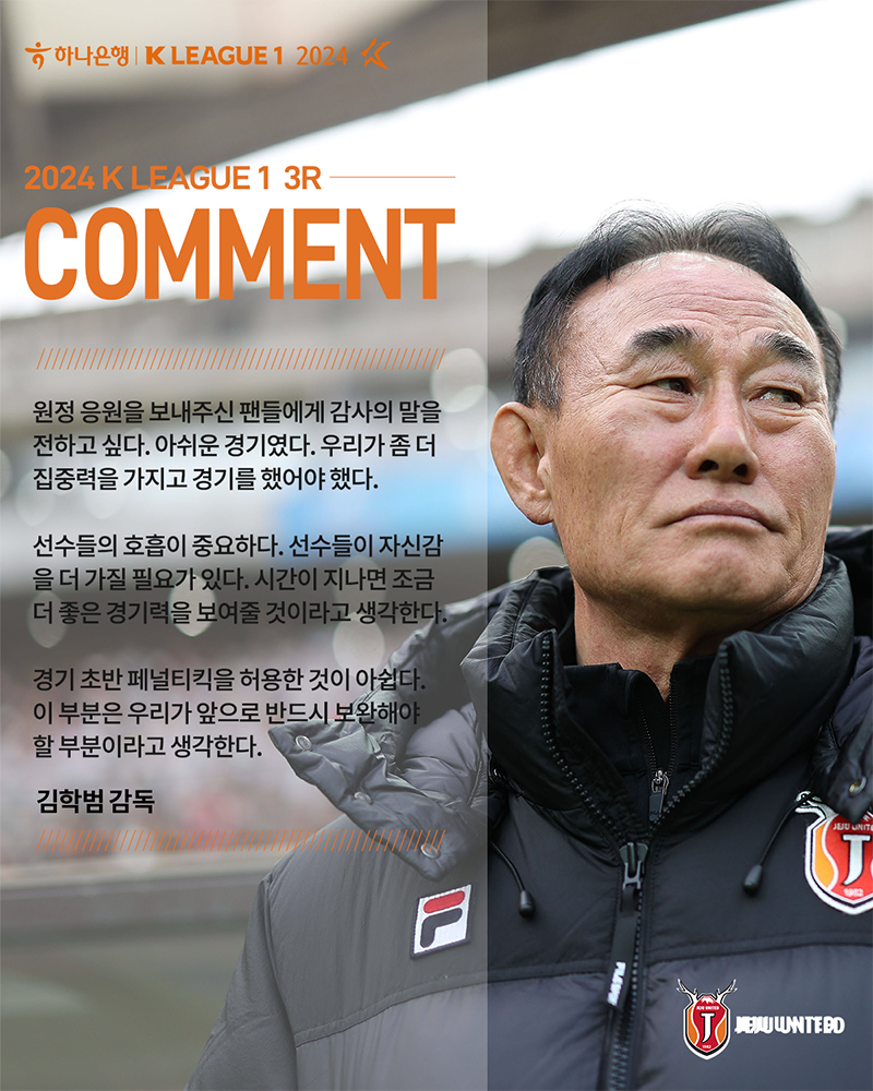 김학범 제주유나이티드(이하 제주) 감독이 패배에 대한 아쉬움을 드러냈다.