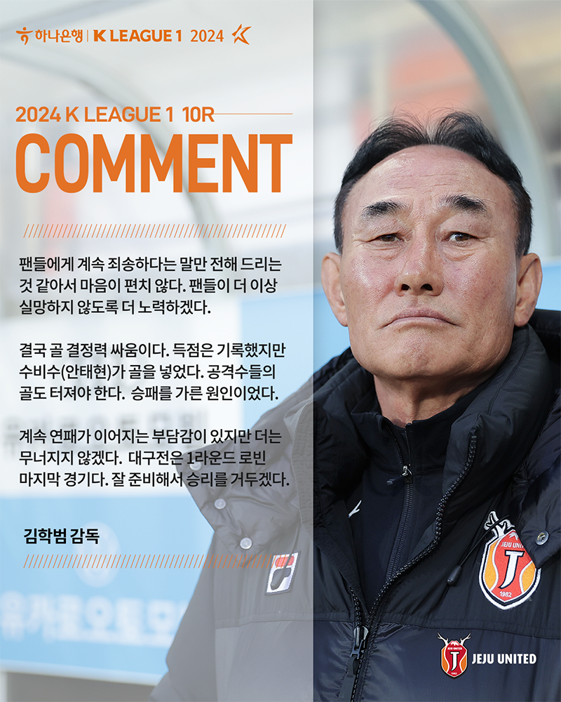 만회의 기회는 있다. 제주는 5월 6일(월) 대구와의 홈 경기에서 연패 탈출에 다시 나선다. 김학범 감독은 "계속 연패가 이어지는 부담감이 있지만 더는 무너지지 않겠다. 대구전은 1라운드 로빈 마지막 경기다. 잘 준비해서 승리를 거두겠다."라고 앞으로의 선전을 다짐했다.