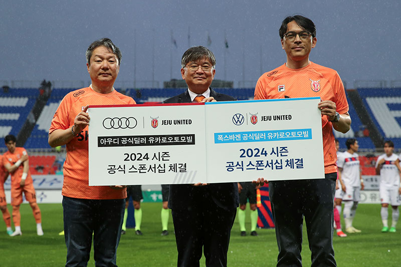 제주는 5월 26일(일) 오후 7시 제주월드컵경기장에서 열린 하나은행 K리그1 2024 14라운드 홈 경기에서 수원FC를 상대로 1-0 승리를 거머쥐며 단숨에 리그 순위 7위까지 올라섰다. 이날 경기에 든든한 응원군도 함께 뛰었다. 아우디 폭스바겐 공식딜러 유카로오토모빌과 스폰서DAY 및 협약식을 가지고 다양한 행사 진행을 비롯해 경기장을 찾은 팬들에게도 많은 혜택을 제공한 것이다.