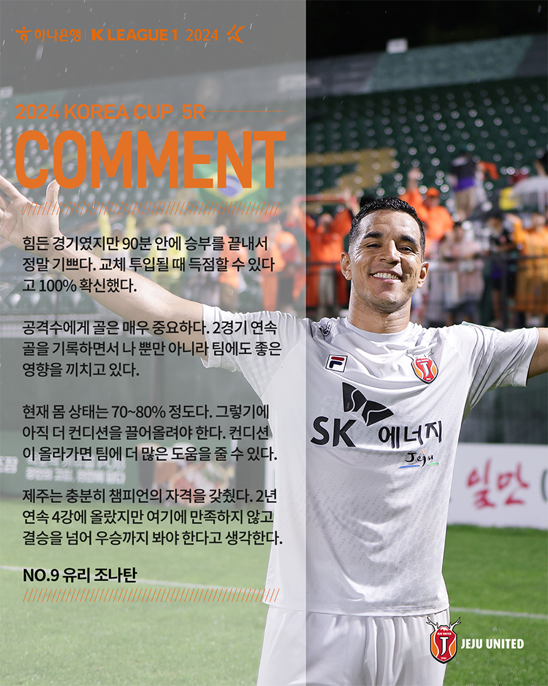 제주유나이티드(이하 제주)의 간판 공격수 유리 조나탄이 코리아컵 우승을 향한 열망을 숨기지 않았다.
