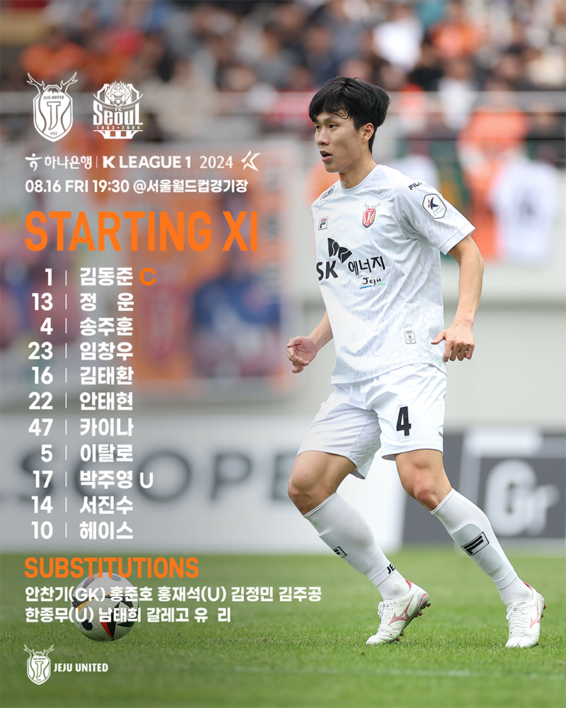 원정팀 제주는 4-4-2 포메이션으로 나섰다. 서진수-헤이스가 최전방에 포진했고 미드필더진은 안태현-카이나-이탈로-박주영이었다. 수비진은 정운-송주훈-임창우-김태환이었다. 골키퍼 장갑은 김동준이 꼈다.