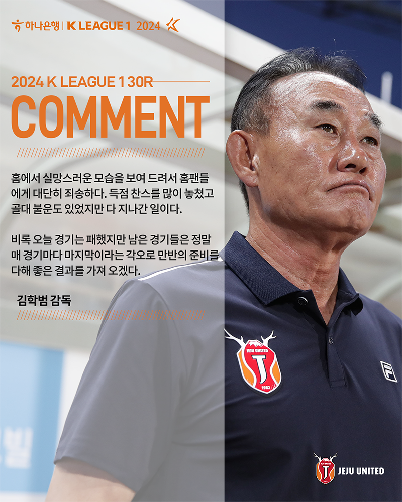 파이널라운드까지 3경기가 남은 가운데 제주는 강등권과의 격차가 더 좁혀졌다. 이에 김학범 감독은 "비록 오늘 경기는 패배했지만 남은 경기들은 정말 매 경기마다 마지막이라는 각오로 만반의 준비를 다해 좋은 결과를 가져 오겠다"라고 앞으로의 선전을 다짐했다.