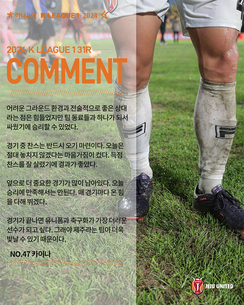 이어 "경기가 끝나면 유니폼과 축구화가 가장 더러운 선수가 되고 싶다. 그래야 제주라는 팀이 더욱 빛날 수 있기 때문이다"라고 헌신의 의미를 되새겼다.