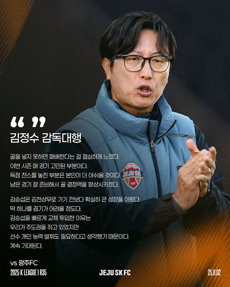 제주SK는 11월 2일(일) 오후 2시 광주월드컵경기장에서 열린 광주FC와의 하나은행 K리그1 2025 35라운드 원정경기에서 0-2로 패했다. 이날 경기서 제주SK는 슈팅수에서 11:4로 압도했지만 아쉽게도 골 결정력이 따라주지 않았다.