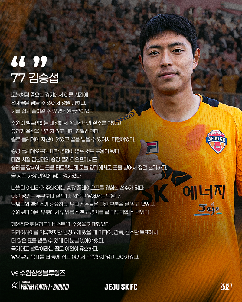 제주SK는 12월 7일(일) 오후 2시 제주월드컵경기장에서 열린 수원과의 하나은행 K리그 승강 플레이오프(PO) 2025에서 김승섭과 이탈로의 연속골로 2-0 승리를 거뒀다. 12월 3일(수) 원정 1차전에서 1-0 승리를 거뒀던 제주SK는 1,2차전 모두 승리하며 K리그1 잔류를 확정지었다.