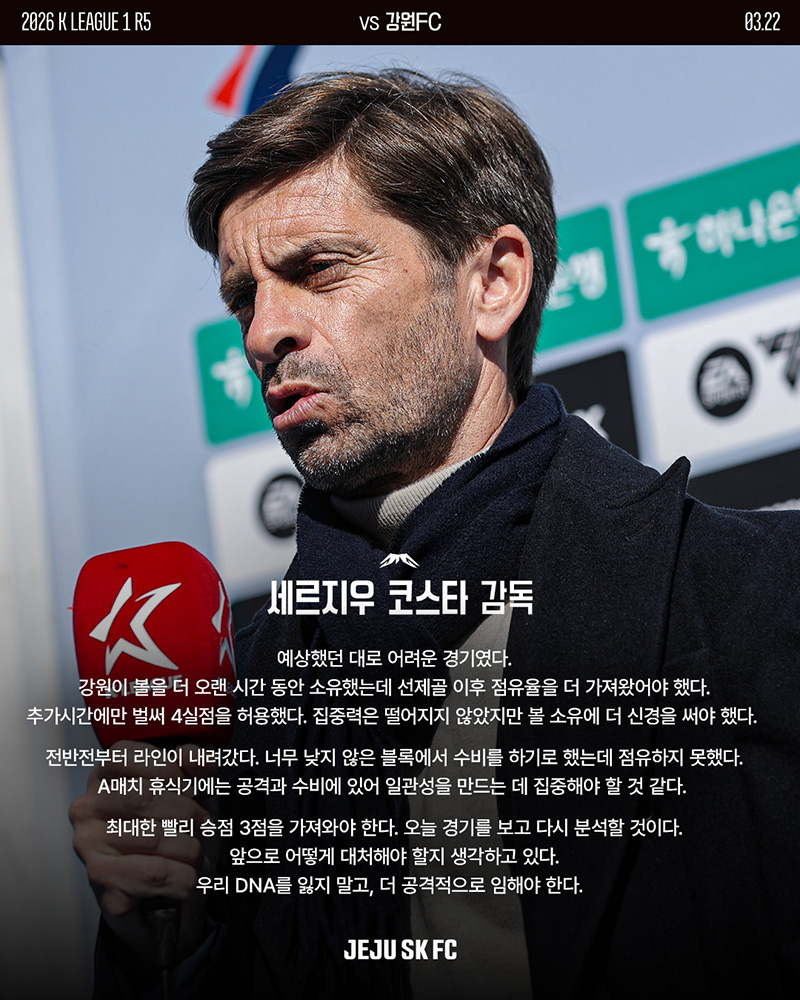 제주는 3월 22일(일) 오후 4시30분 강릉하이원아레나에서 열린 강원FC와의 하나은행 K리그1 2026 5라운드 원정경기에서 1-1로 승부를 가리지 못했다. 경기 후 세르지우 코스타 감독은 선제골 이후 볼 점유율 경쟁에서 저조했던 점을 아쉬워했다.
