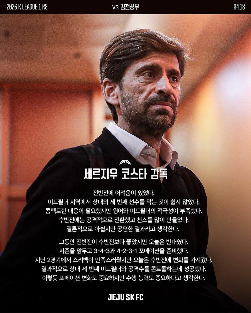 제주SK FC(이하 제주SK)의 세르지우 코스타 감독이 무승부로 끝난 김천 상무전을 복기하며 심기일전했다.
