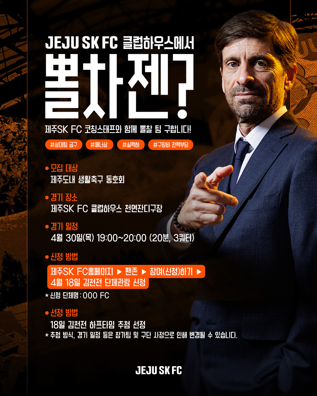 제주SK FC 홈페이지 ▶ 팬존 ▶ 참여(신청)하기 ▶ 단체관람 신청(4/18 김천전) ▶ 김천전 하프타임 추첨을 통해 1팀 선정