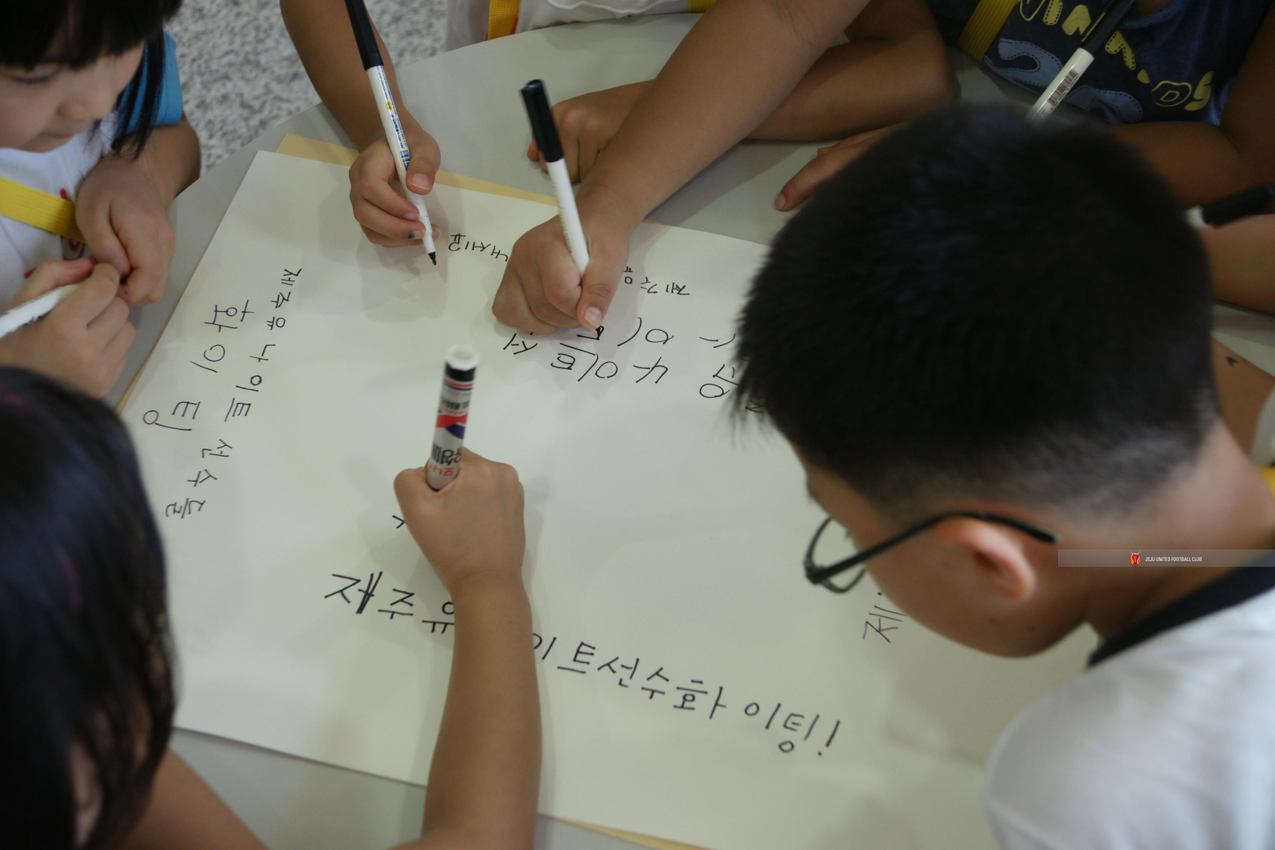 제주유나이티드 승리를 위해 응원 페이퍼를 작성하는 초록사과 친구들..
