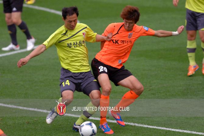 서동현 선수가 부산의 김한윤 선수와 치열한 볼 경합을 펼치고 있습니다.