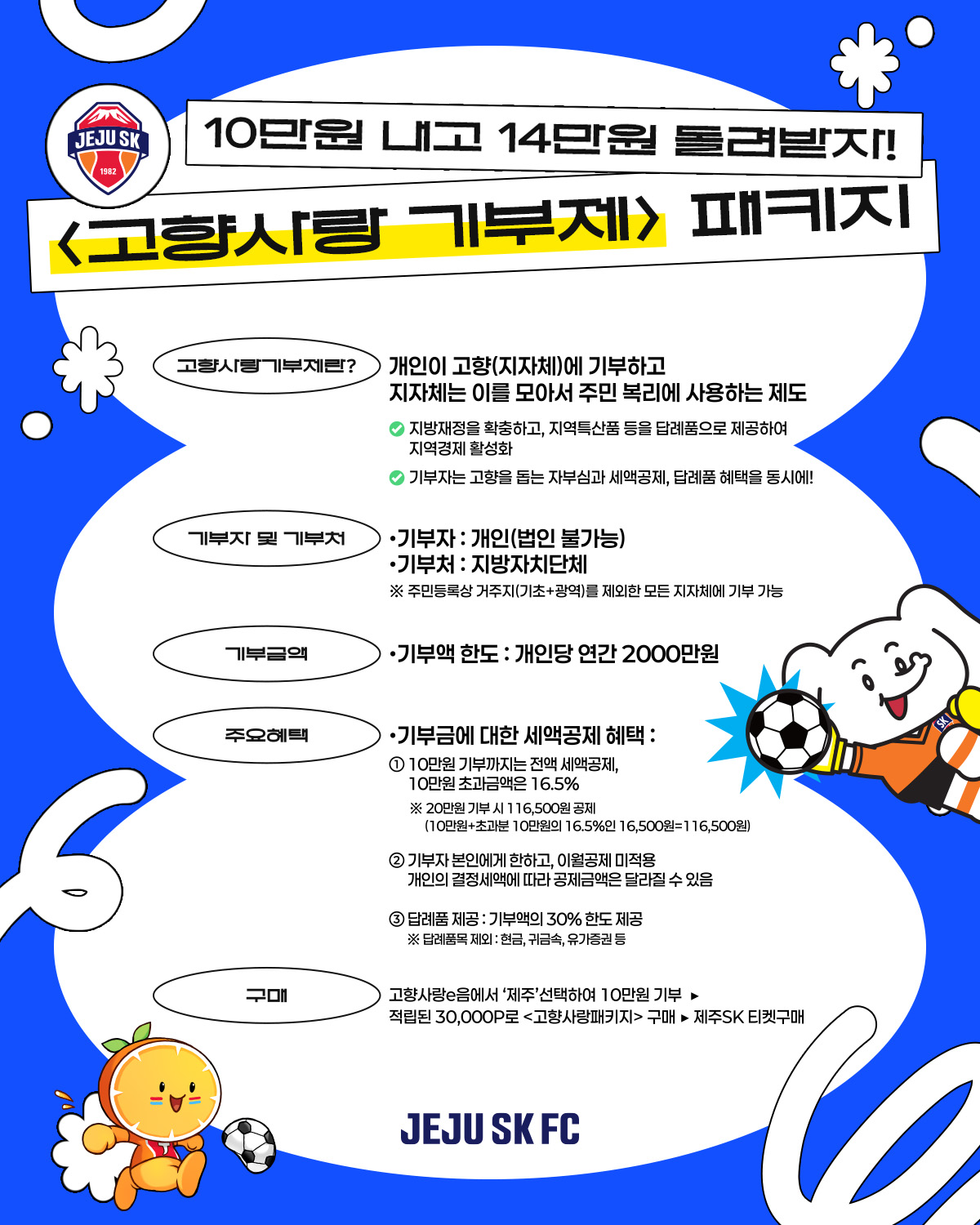 - 고향사랑e음 '제주' 선택하여 10만원 기부 → 적립된 30,000P로 '고향사랑패키지' 구매 → 제주SK 티켓 구매
